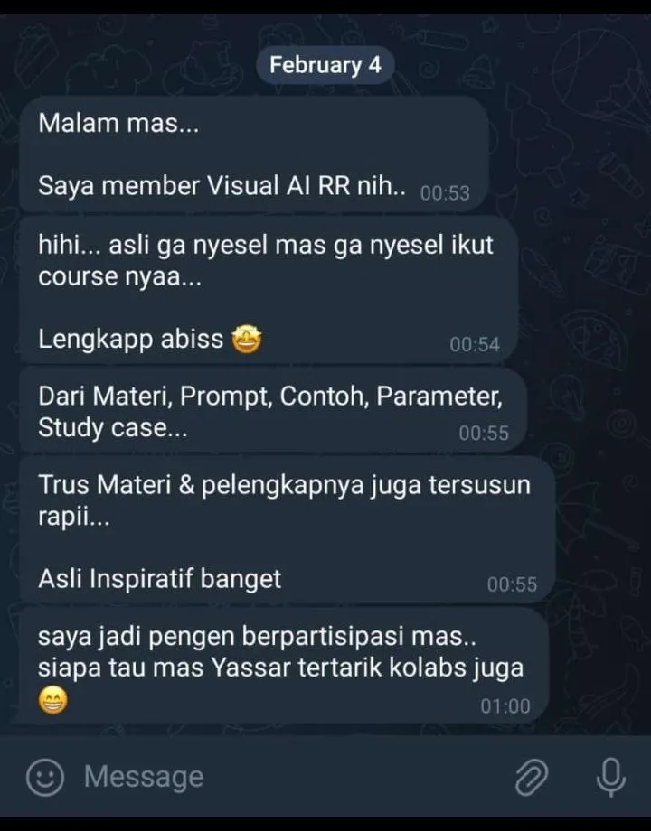 Sistem pembelajarannya adalah Anda belajar secara mandiri. Nantinya panduan beserta materi utama kami sediakan di member area & GRUP TELEGRAM berupa akses prompt & Video panduan, bisa Anda pelajari kapanpun Anda mau dan punya waktu
